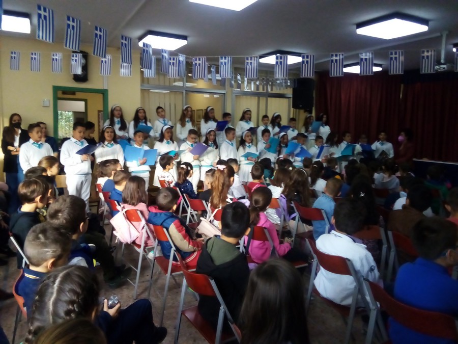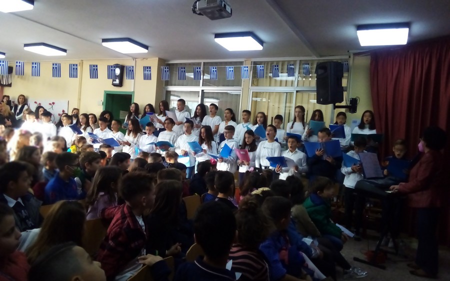 Τα τμήματα Ε1 και Ε2 του σχολείου μας, παρουσίασαν με ιδιαίτερο σεβασμό προς τους ήρωες της Ελλάδας μας, θεατρικά δρώμενα, τα οποία συνόδευσαν με επετειακά τραγούδια, αφιερωμένα στο 1940. Οι μαθητές της ΣΤ τάξης με το μεράκι τους και τις φωνητικές τους ικανότητες πλαισίωσαν το εγχείρημα αυτό, το οποίο με πολλή συγκίνηση υποδεχτήκαμε μετά από χρόνια απουσίας.