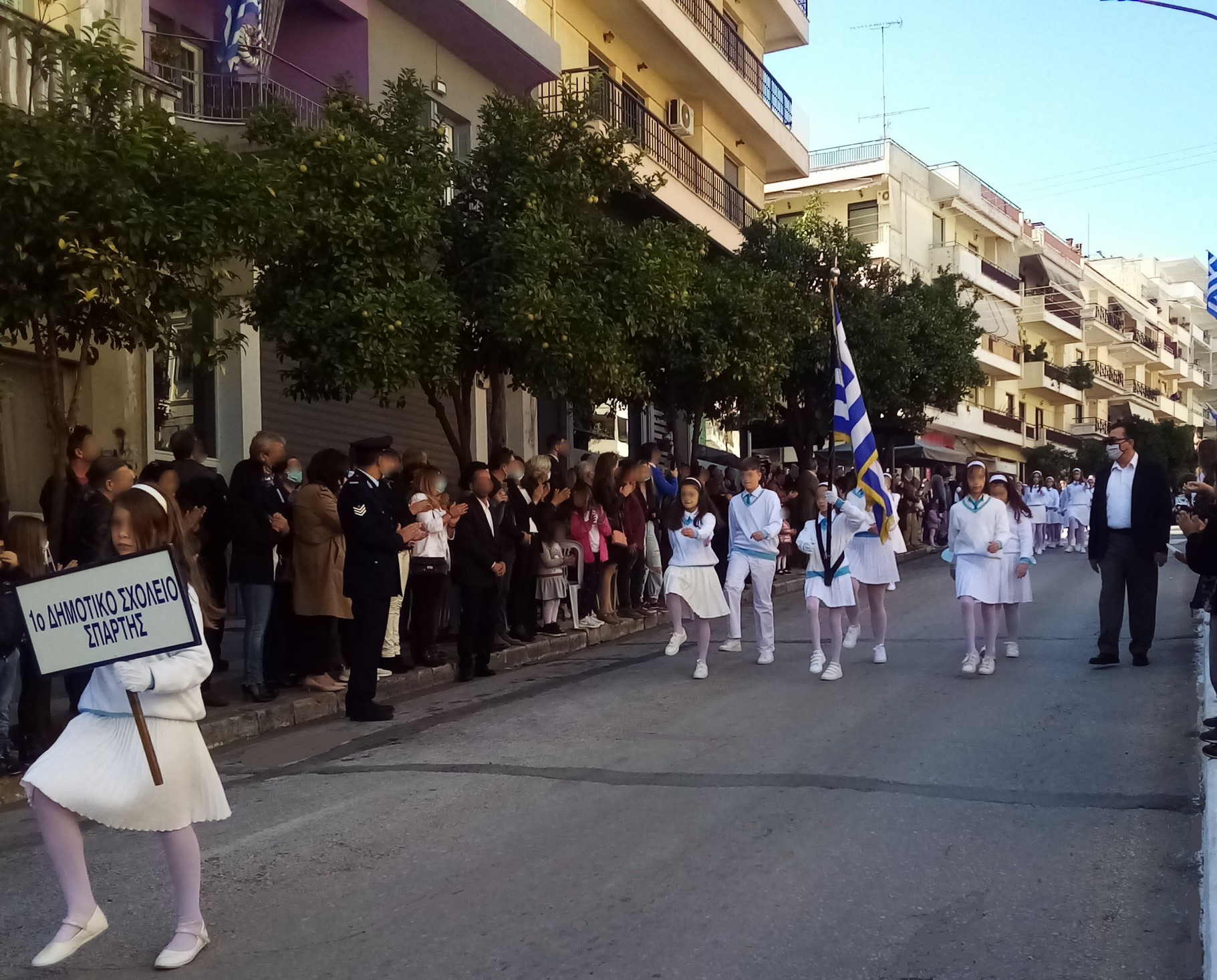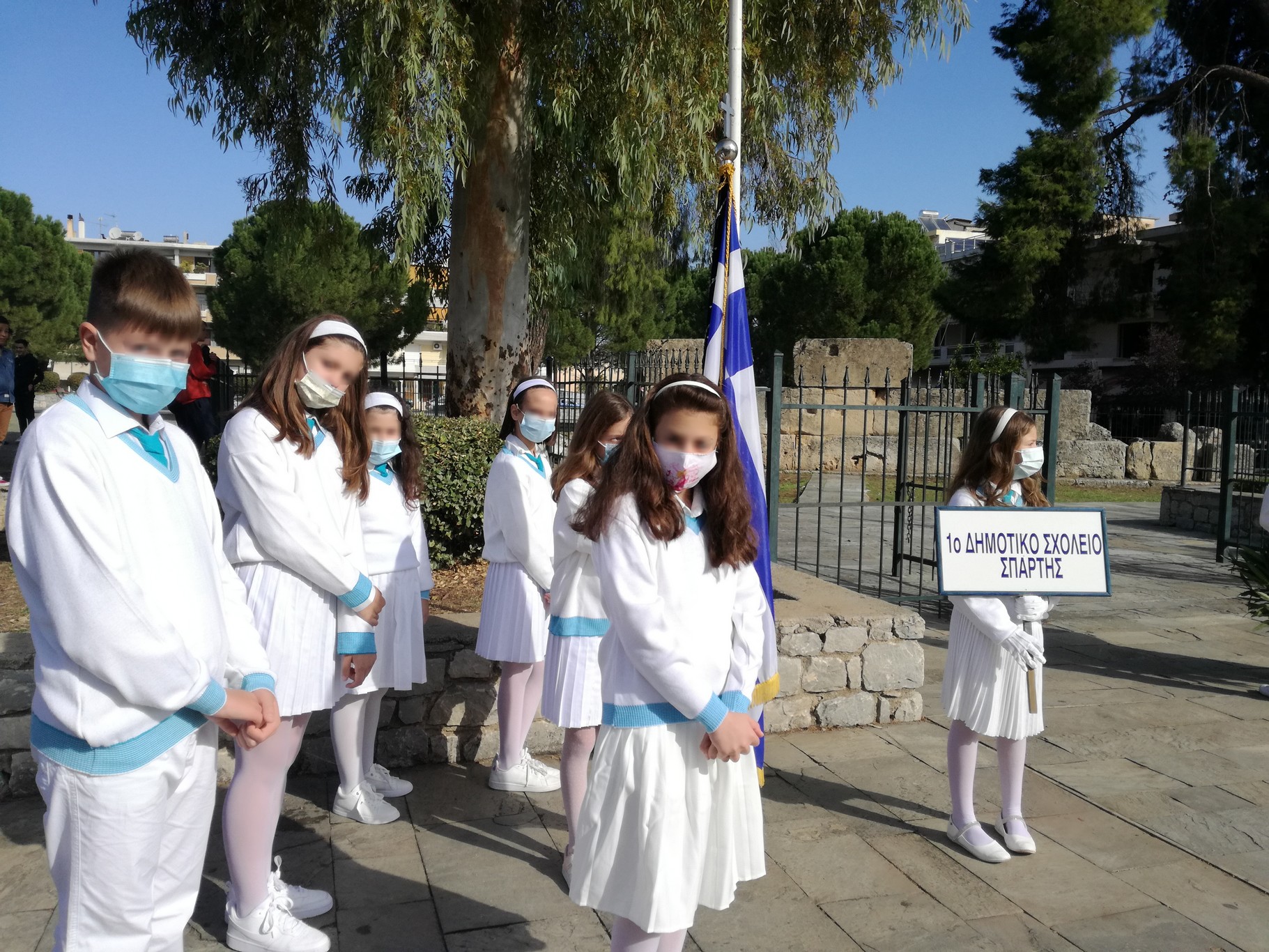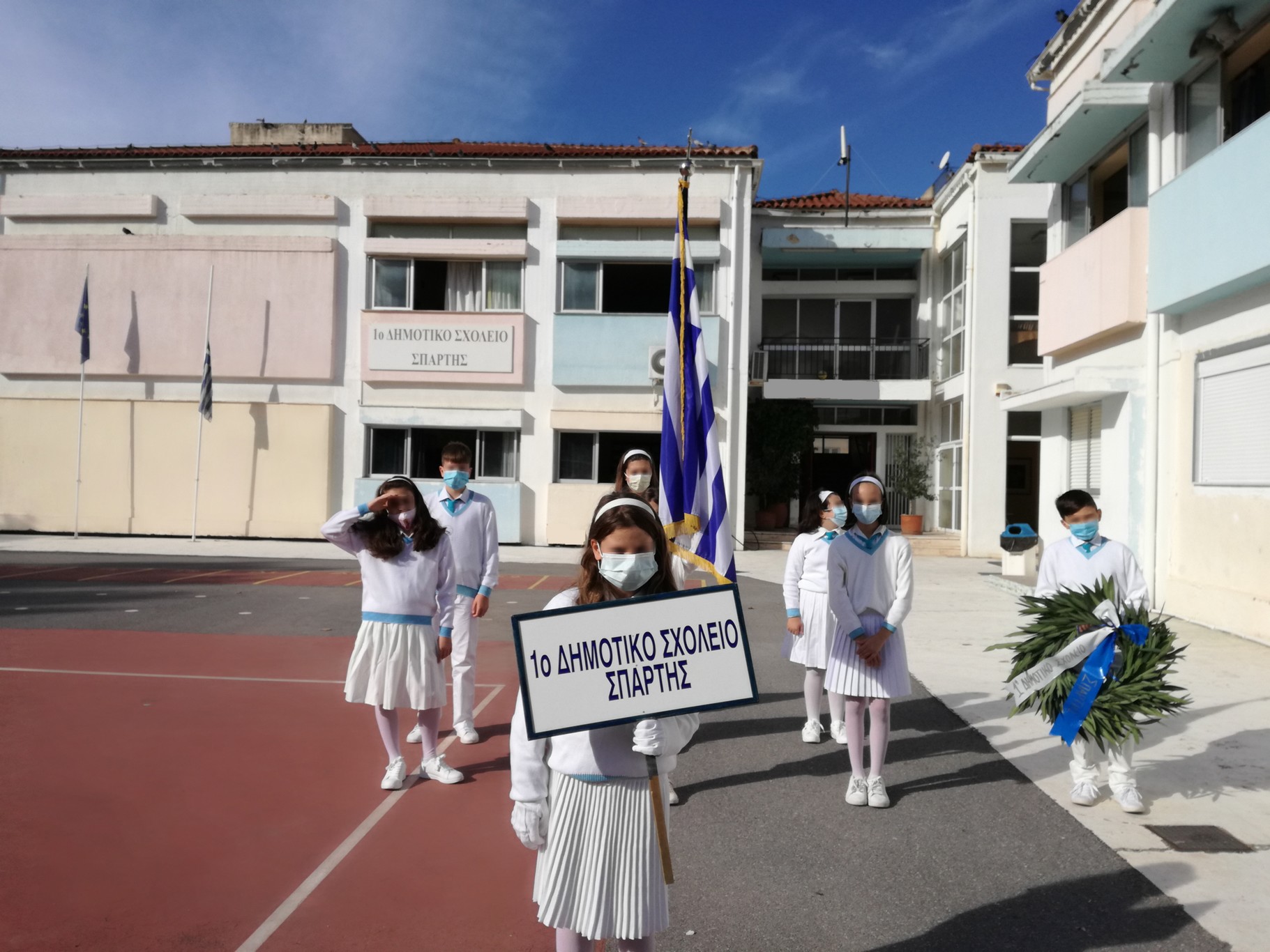 Με απλό και λιτό τρόπο, εξαιτίας των συνθηκών της πανδημίας, το 1ο Δημοτικό σχολείο Σπάρτης τίμησε φέτος την επέτειο της 28ης Οκτωβρίου. Η σημαία και οι εκπαιδευτικοί του σχολείου παρέστησαν στην καθιερωμένη κατάθεση στεφάνου στο ιστορικό κενοτάφιο του Σπαρτιάτη βασιλιά Λεωνίδα. Το 1ο Δημοτικό σχολείο κατέθεσε το δικό του στεφάνι σε ένδειξη τιμής κι ευγνωμοσύνης στη μνήμη των ηρώων του 1940.