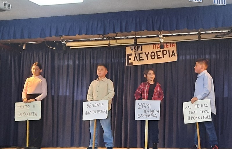 Στις 15-11-2024 πραγματοποιήθηκε η γιορτή της Δ' τάξης του σχολείου μας για την επέτειο του Πολυτεχνείου. Στη διάρκειά της παρουσιάστηκαν θεατρικά δρώμενα, αφηγήσεις ιστορικών γεγονότων από την Δ΄ τάξη, ακούστηκαν ηχητικά αρχεία από το Πολυτεχνείο και τραγούδια της εποχής από τη χορωδία της ΣΤ τάξης.