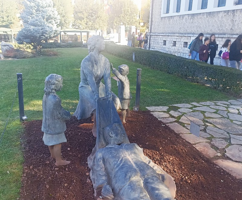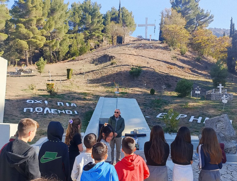 Κατηφορίζοντας για τα Καλάβρυτα, σταματήσαμε στον λόφο του Καπή, στον τόπο θυσίας, με τον μεγάλο σταυρό και τις τεράστιες μαρμάρινες στήλες με τα ονόματα των εκτελεσθέντων να μας θυμίζουν τη ναζιστική βαναυσότητα που υπέφερε ο λαός μας στα χρόνια της Κατοχής. Ύστερα στο Δημοτικό Μουσείο του Καλαβρυτινού Ολοκαυτώματος ο ξεναγός μας ξετύλιξε το κουβάρι των μελανών γεγονότων και μελετήσαμε τα εκθέματα.