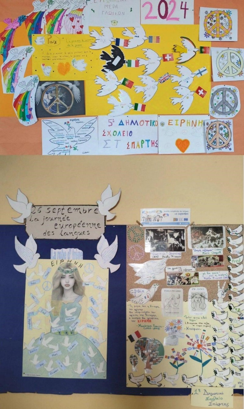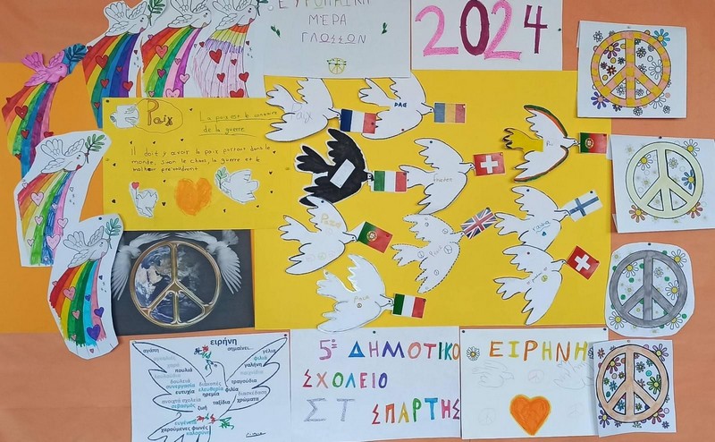 Στο πλαίσιο της καλής συνεργασίας και αλληλεπίδρασης με άλλες σχολικές μονάδες της πόλης μας, ο μαθητές του 1ου, 3ου και 5ου Δημοτικού Σχολείου Σπάρτης, με την καθοδήγηση και υποστήριξη των εκπαιδευτικών Γαλλικής Γλώσσας κ. Βαν Χάουντ Μαργαρίτας (1ο Δημοτικό Σχολείο Σπάρτης), κ. Ηλιοπούλου Παναγιώτας (3ο Δημοτικό Σχολείο Σπάρτης) και κ. Καπανταϊδάκη Ελένης (5ο Δημοτικό Σχολείο Σπάρτης) δημιούργησαν αφίσες με θέμα την ειρήνη και τη συμβολή των γλωσσών σε αυτή.