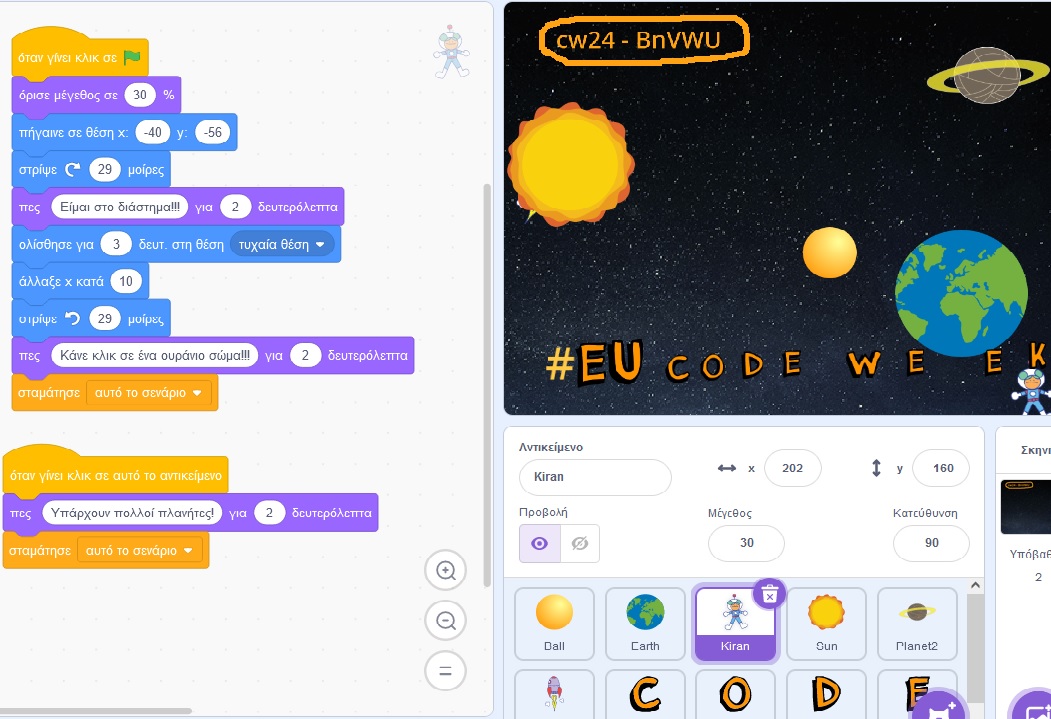 - Εξερευνώντας το διάστημα - Οι μαθητές/τριες της Δ΄ και Ε΄ τάξης δημιούργησαν κώδικα στο Scratch με κίνηση, ήχο και διαδραστικότητα. Στο τέλος έγινε αλλαγή θέσεων μεταξύ των ομάδων για ανταλλαγή γνώσεων. Δείτε τη περιγραφή: https://codeweek.eu/view/635187/ekserefnwntas-to-diastima-me-to-scratch και ένα παράδειγμα https://scratch.mit.edu/projects/1085001930