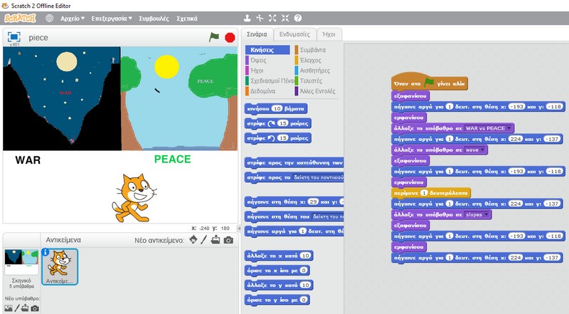 Peace everywhere! Never war! - Οι μαθητές/τριες της ΣΤ΄ τάξης έφτιαξαν μια παρουσίαση στο Scratch - με αλλαγή σκηνικού. Περιγραφή:https://codeweek.eu/view/659593/peace-everywhere-never-war