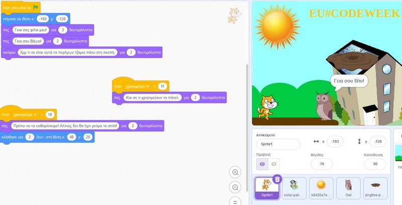 - Οι μαθητές/τριες του Ε1 τμήματος καλούνται μέσα από βασικές εντολές προγραμματισμού να βοηθήσουν τον Βίτο τον γατούλη που αγαπάει τη φυσική, να μάθει περισσότερα για τις μορφές ενέργειας. Περιγραφή: https://codeweek.eu/view/657829/fisiki-morfes-energheias