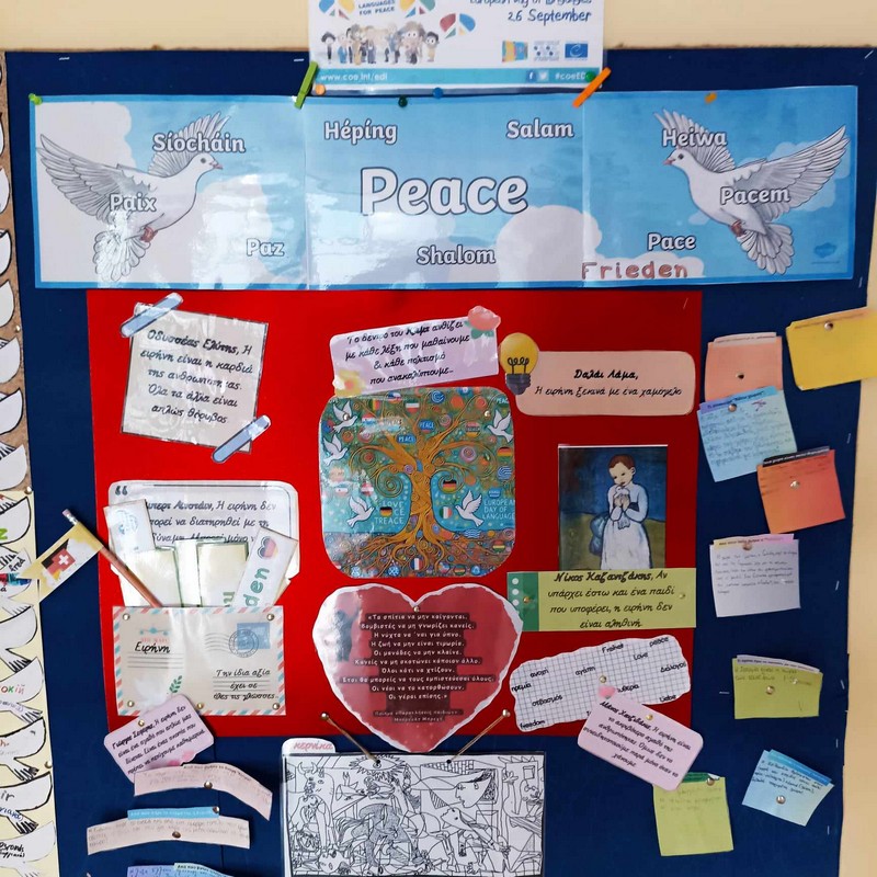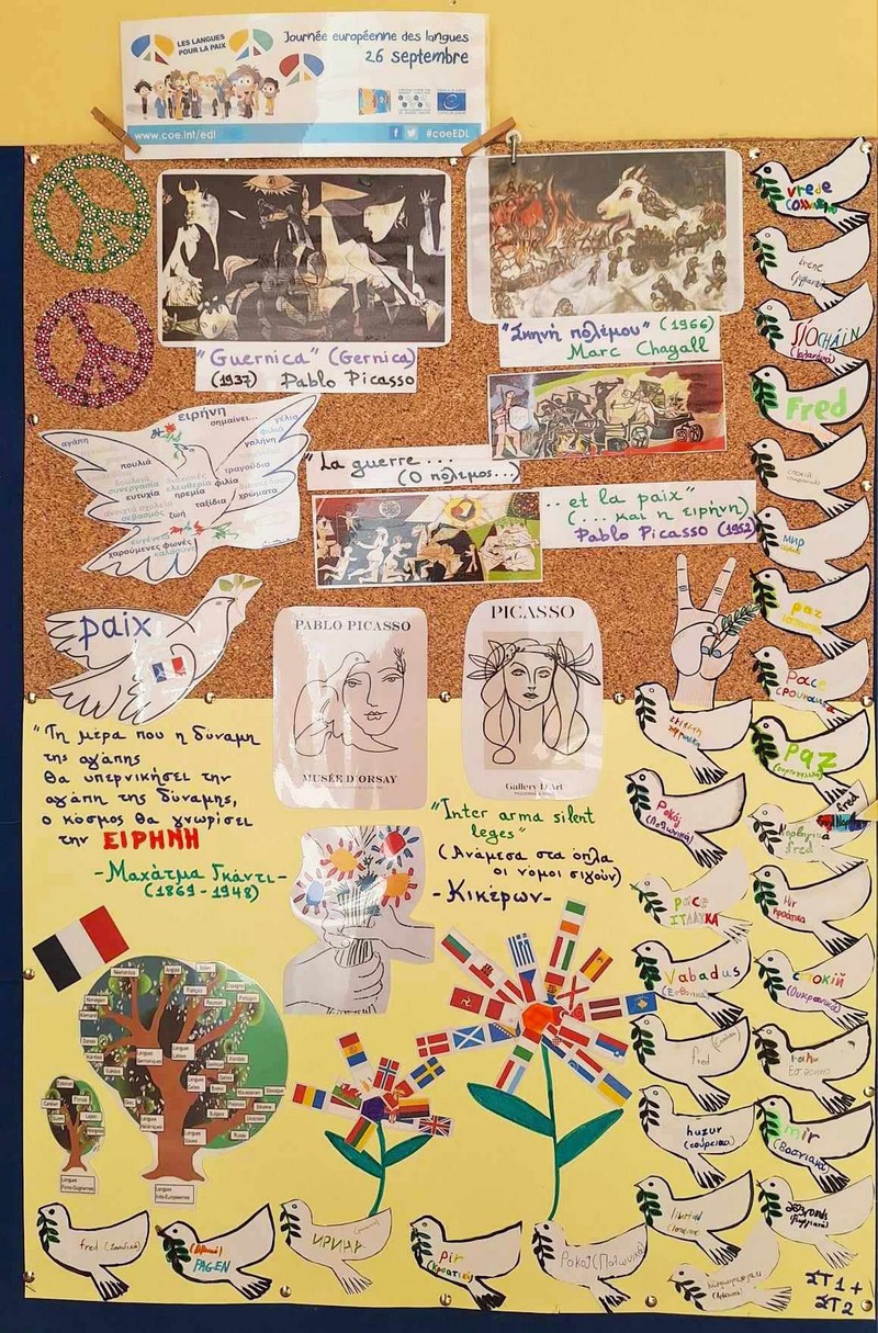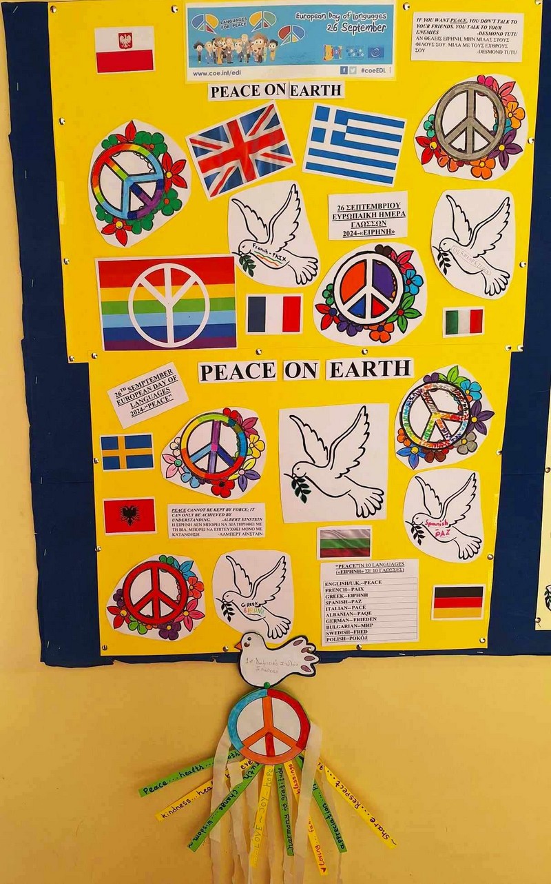 Οι εκπαιδευτικοί ξένων γλωσσών του σχολείου μας Βαν Χάουντ Μαργαρίτα (Γαλλικής Γλώσσας), Παπαντούρος Ευάγγελος και Κριτσιμηλιού Ελένη (Αγγλικής Γλώσσας), Φιλίνη Ιωάννα (Γερμανικής Γλώσσας) συνεργάστηκαν για τη δημιουργία αφισών με θέμα : «2024: Γλώσσες για την ειρήνη», ένα θέμα επίκαιρο και διαχρονικό.