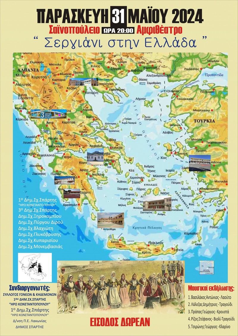 Την Παρασκευή 31 ΜαΪου πραγματοποιήθηκε στο Σαϊνοπούλειο Αμφιθέατρο το 4ο χορευτικό Σεργιάνι στην Ελλάδα, με τη συμμετοχή οκτώ σχολικών μονάδων ΠΕ του Νομού Λακωνίας. Μια μουσικοχορευτική εκδήλωση με παρουσίαση παραδοσιακών χορών από όλη την Ελλάδα.