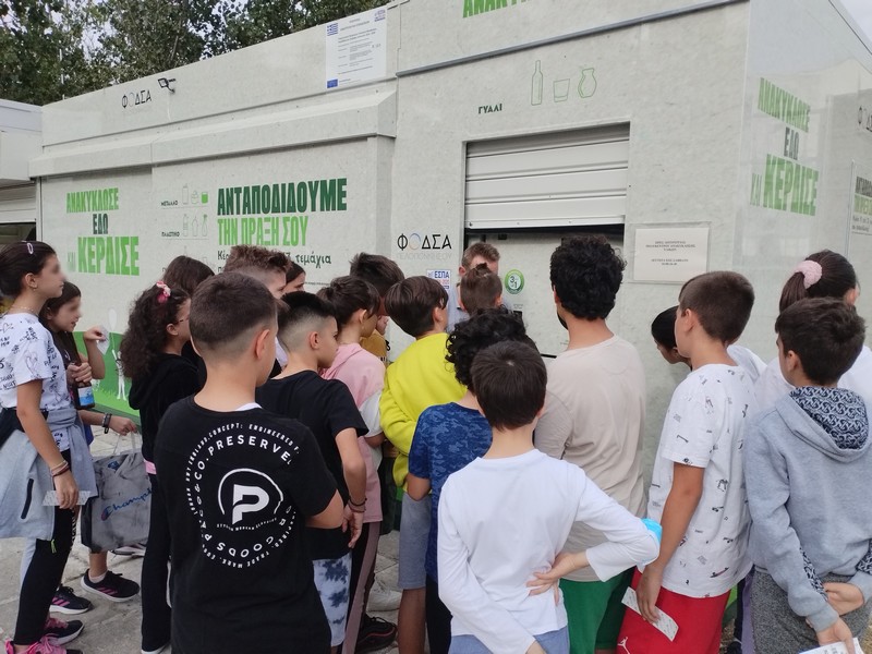 Οι μικροί μαθητές, αφού είχαν ενημερωθεί από την εκπαιδευτικό, μετέβησαν στο μηχάνημα κρατώντας ο καθένας από μια μικρή σακούλα με ανακυκλώσιμα μπουκάλια. Εκεί τους υποδέχτηκαν οι υπάλληλοι του δήμου – υπεύθυνοι για την λειτουργία του μηχανήματος- και με μεγάλη προθυμία βοήθησαν τους μαθητές να ανακυκλώσουν τα υλικά τους. Κατόπιν, τους ενημέρωσαν για το ποια ακριβώς υλικά ανακυκλώνονται και τους έκαναν μια επίδειξη του εσωτερικού του μηχανήματος και του τρόπου λειτουργίας του. Όλα τα παιδιά ενθουσιάστηκαν και φεύγοντας δήλωσαν ότι θα επιστρέψουν ξανά στο μηχάνημα, με τους γονείς τους αυτή τη φορά και φυσικά με περισσότερα υλικά.