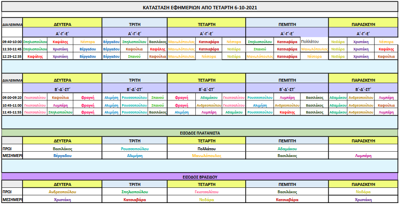 κατόπιν ενεργειών μας προς το Τμήμα Τροχαίας και τον Δήμο Σπάρτης, προκειμένου να εξασφαλίσουμε τη χρήση της δεύτερης εισόδου- εξόδου επί της οδού Βρασίδου, σας ενημερώνουμε ότι από τη Δευτέρα, 20-09-21, η προσέλευση και η αποχώρηση των μαθητών/τριών θα γίνεται ως εξής:
