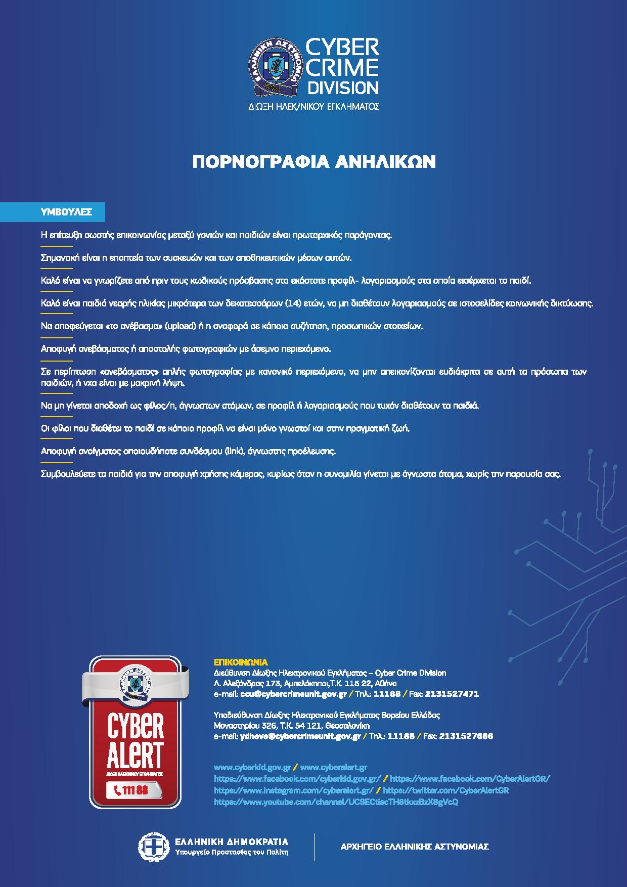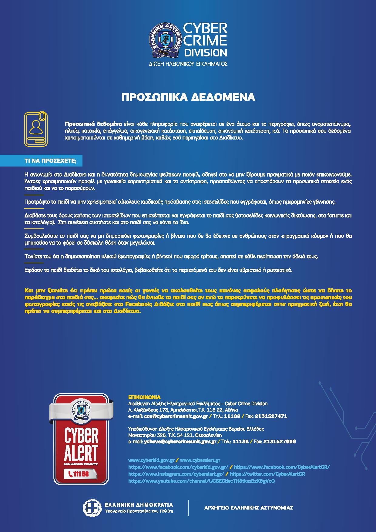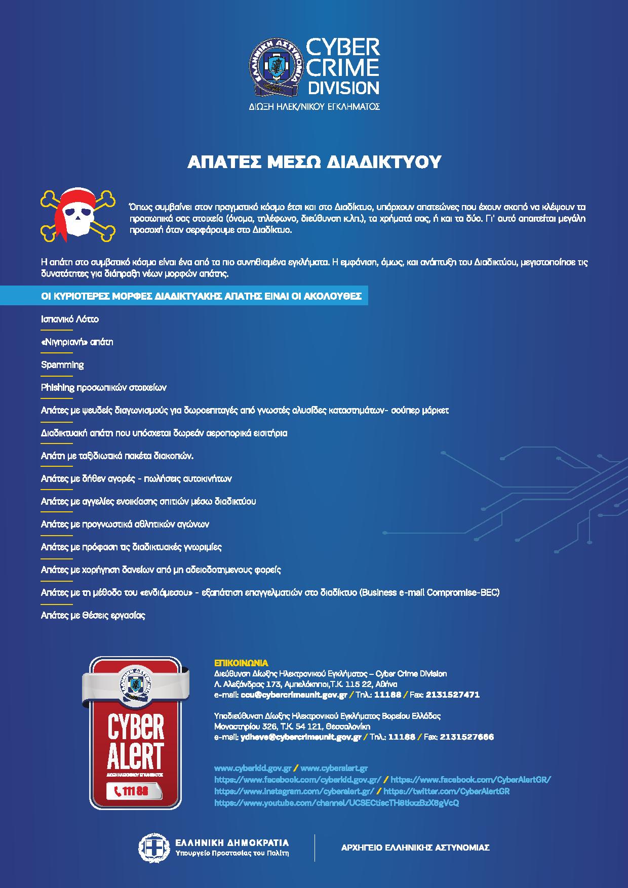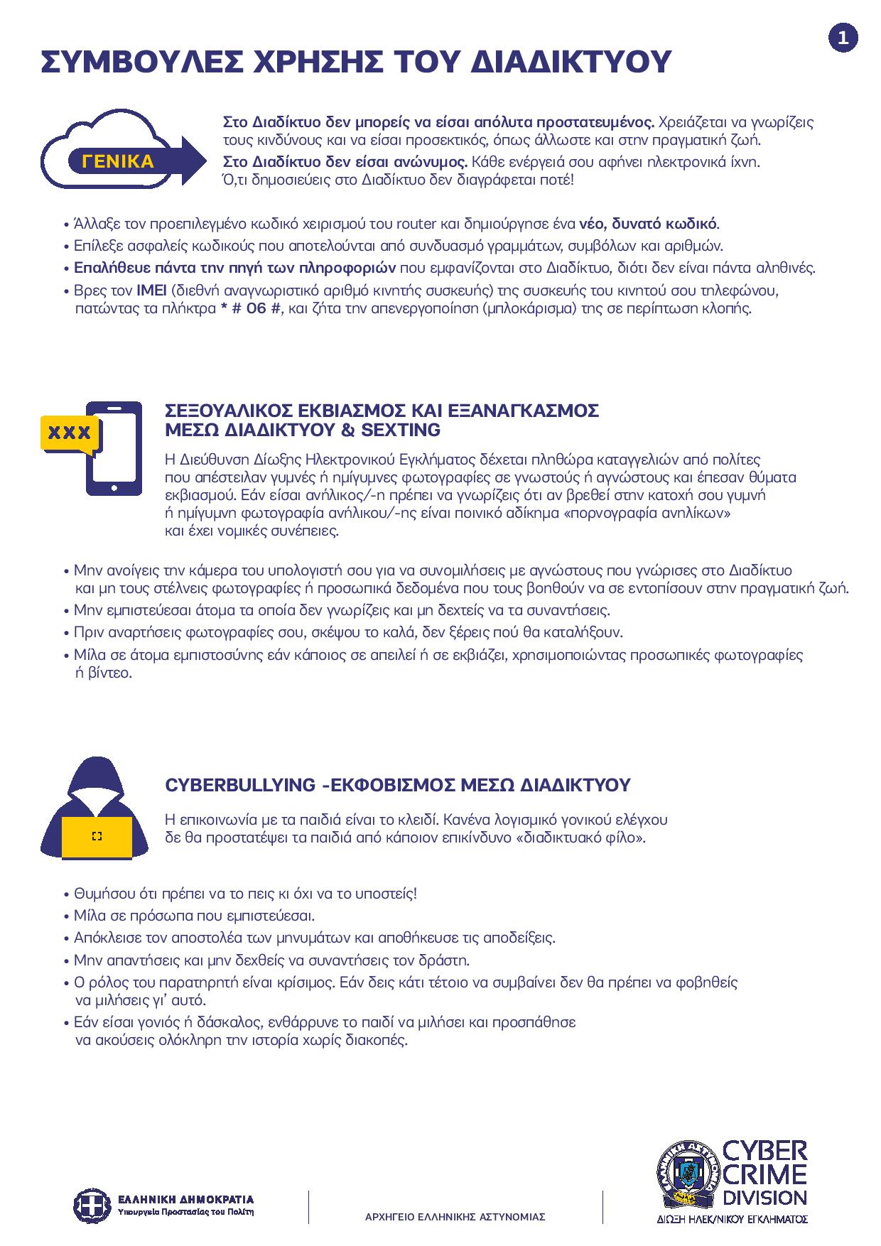 Ενημερωτικό υλικό της Διεύθυνσης Δίωξης Ηλεκτρονικού Εγκλήματος του Υπουργείου Προστασίας του Πολίτη σχετικά με την ασφαλή πλοήγηση στο διαδίκτυο.