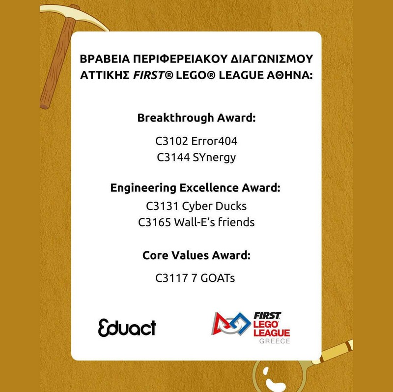 Στις 8-2-2026 η ομάδα Wall-E's friends με μαθητές/τριες της Ε΄, ΣΤ΄ του 1ου Δημοτικού σχολείου Σπάρτης και της Α΄ γυμνασίου του 2ου γυμνάσιου Σπάρτης ξεκίνησε το ταξίδι του διαγωνισμού FLL Challenge της Eduact. Κέρδισε το βραβείο Engineering Excellence Award και το εισητήριο για τους τελικούς στην Θεσσαλονίκη 21-22 Μαρτίου.
