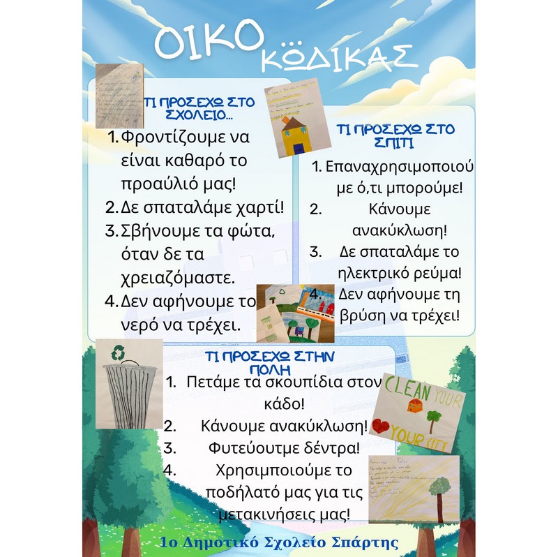 Πιο συγκεκριμένα, οι μαθητές έχουν διεξάγει έρευνες στο χώρο του σχολείου με θέμα τη διαχείριση των απορριμμάτων και τη σωστή διαχείριση της ενέργειας και των πρώτων υλών. Έχουν δημιουργήσει έργα από ανακυκλώσιμα υλικά ή από υλικά που θα κατέληγαν στα σκουπίδια αποδεικνύοντας ότι πρέπει να επαναχρησιμοποιούμε και να δίνουμε ζωή σε αντικείμενα που δε χρειαζόμαστε πια. Επιπλέον, οι μαθητές και οι γονείς τους βοήθησαν να καθαριστούν πάρκα της πόλης μας, ακτές του νομού μας και με τη βοήθεια του Δήμου Σπάρτης συμμετείχαν σε δράσεις δεντροφύτευσης.